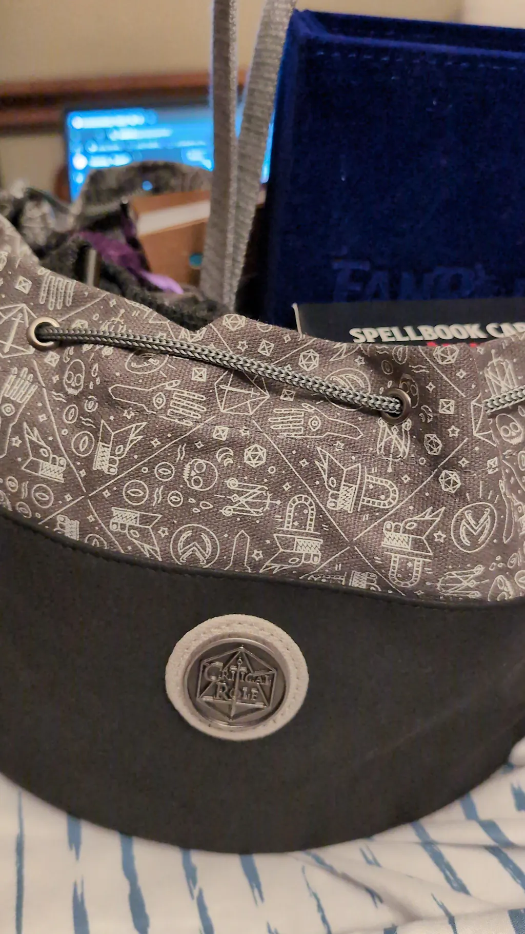 This version of Bailey's Dice Bag of Hoarding features gray canvas with patterned icons inspired by the Vox Machina and Mighty Nein campaigns and black suede.