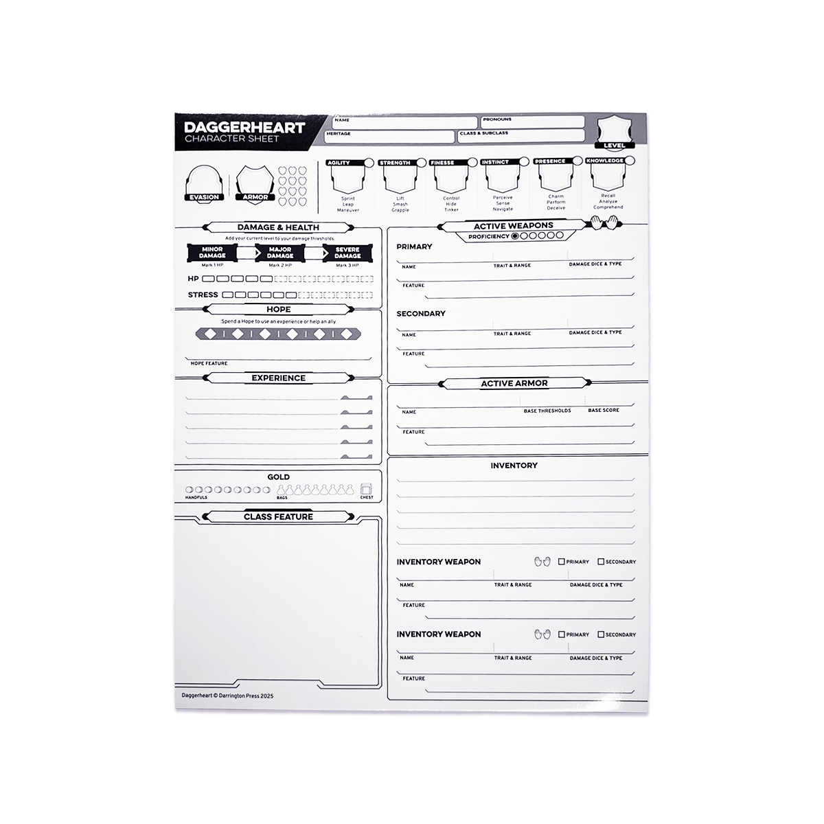 • Includes a dry/wet erase Daggerheart character sheet for fast and easy tracking (marker not included).