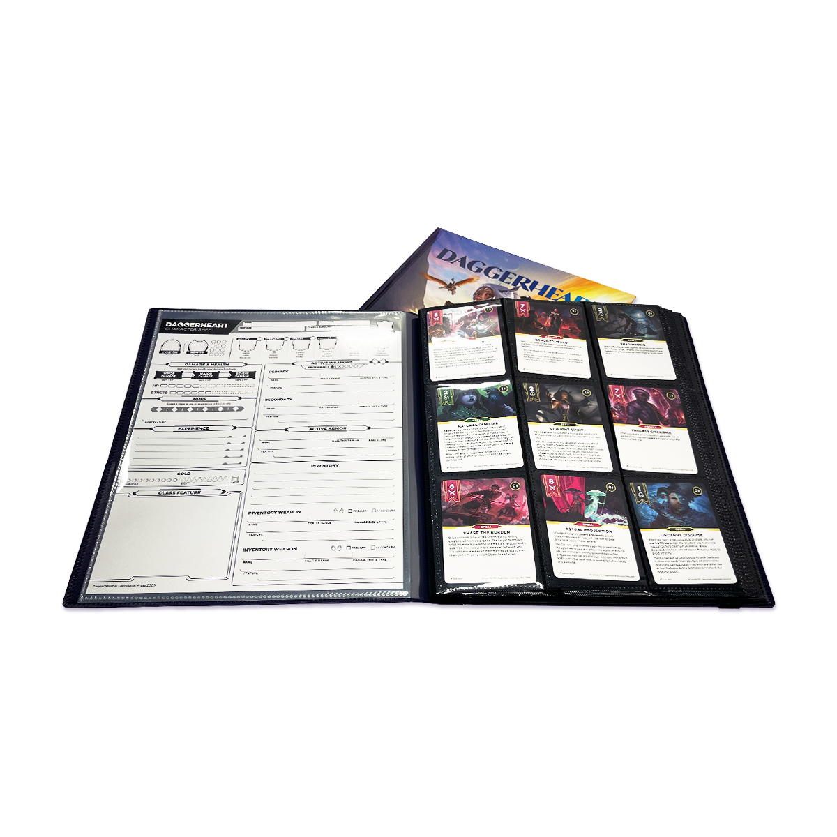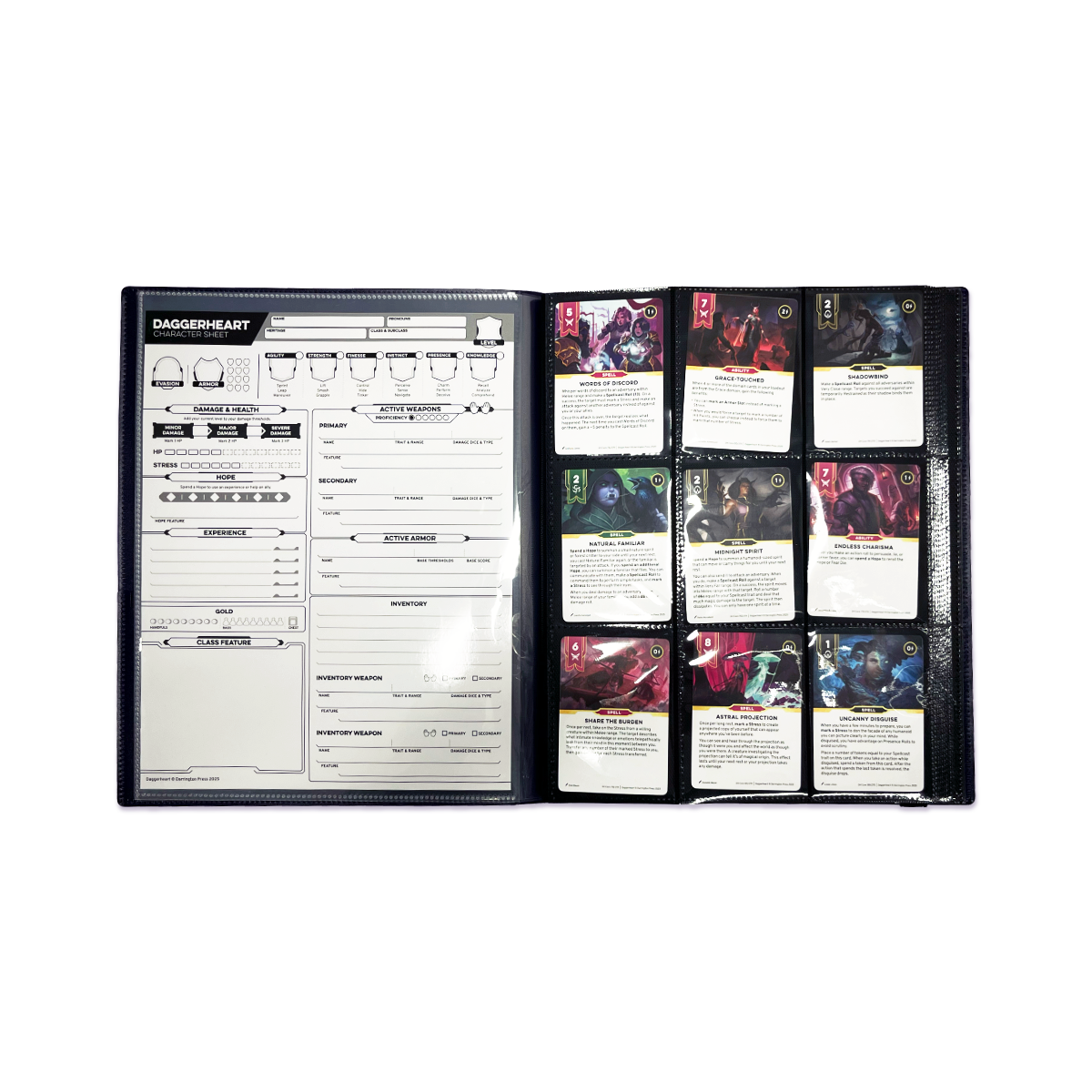 Whether you're diving into an epic battle or spawning new tales of hope and heroism, the Daggerheart Folio keeps your story safe—one card at a time with room for every card in the Daggerheart Core Set and more, sleeves for 6 full-page (8.5" x 11") sheets for your character sheets or notes, plus additional inside cover pockets. And to make tracking easier, there is a dry erase character sheet included. Made for players and GMs alike, this folio was carefully designed to protect and organize character and gameplay cards for the true adventurer wanting to carry their Daggerheart cards, sheets, and notes in style. It’s gorgeously illustrated with the Daggerheart domain wheel on the front cover, and the official Daggerheart logo on the back.