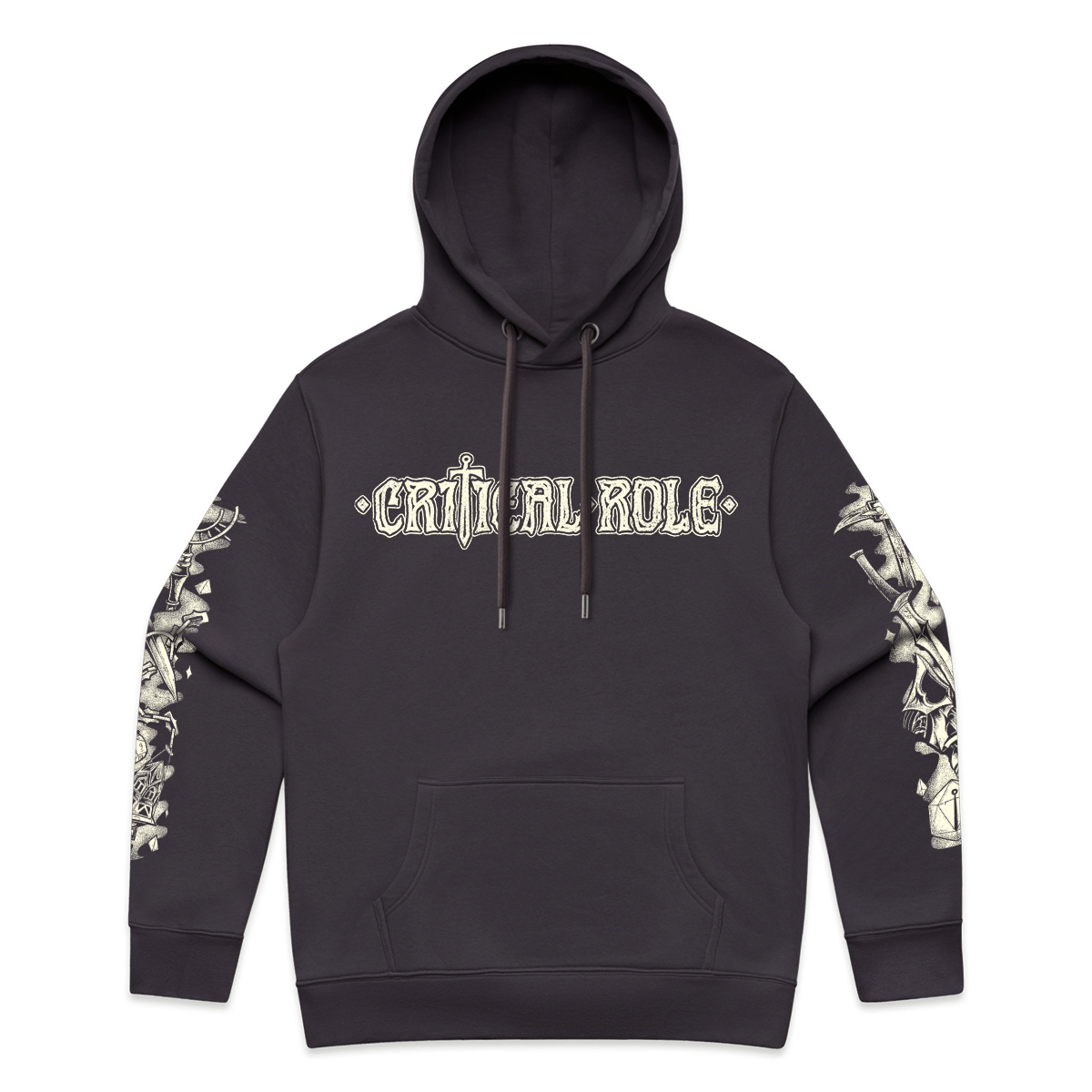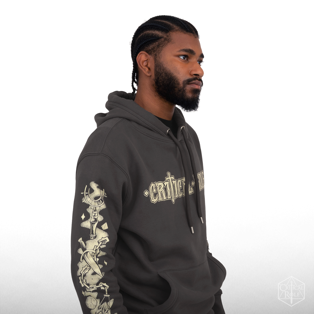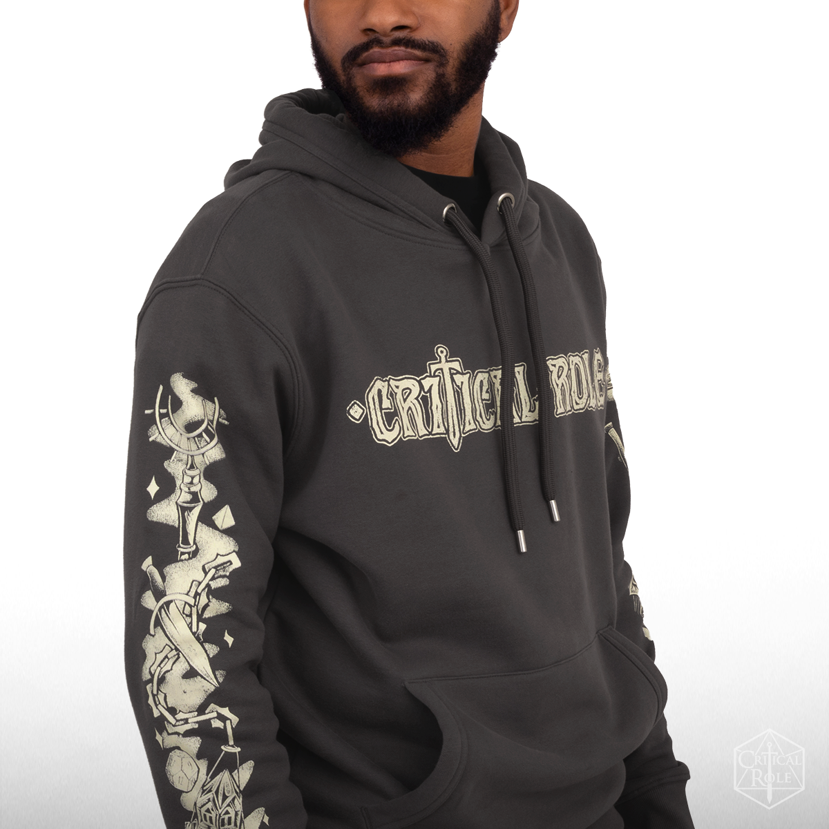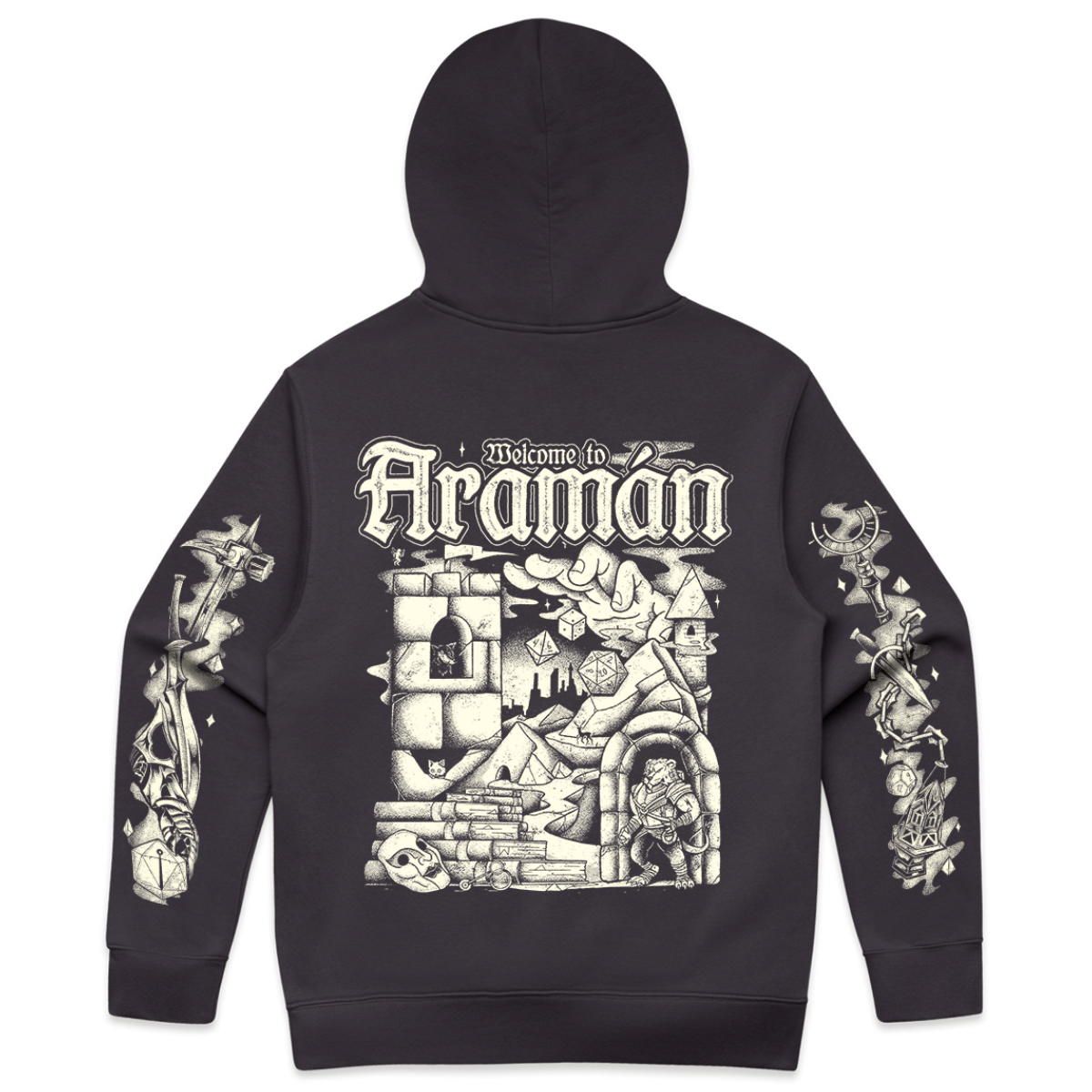 Step into the story before the dice even fall with this dark gray pullover hoodie that feels like a Thursday evening at the table—extra cozy! Across the chest, Critical Role appears in a stylized handwritten script; turn it around, and the journey opens up an oversized illustrated Welcome to Aramán within a retro-inspired RPG scene layered with C4 secrets to be discovered. Teor stands ready for battle on the journey ahead, while Bolaire’s mask and Murray’s eyeglass rest against a stack of well-worn books. Thaisha’s deer familiar keeps watch in the distance as Occtis’ companion Pincushion and Kattigan’s loyal Wulferic peek out from the tower’s shadow. Above it all, Thimble circles the sky as a Game Master’s hand appears overhead scattering falling dice.