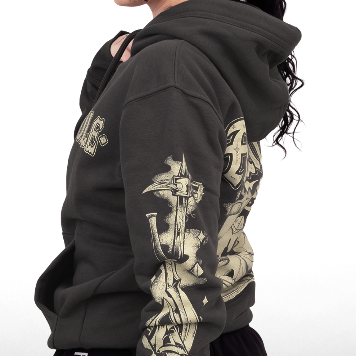 The sleeves carry the rest of the party with you on your journey with their weapons etched like relics along the fabric. Azune’s war pick, the Liar’s Blade of Thjazi and Halandil, and Sir Julien’s gauntlet line one arm. The other arm bears Wiccander’s staff, Tyranny’s dagger, and Vaelus’ censer—instruments of magic, credence, and silent strength.