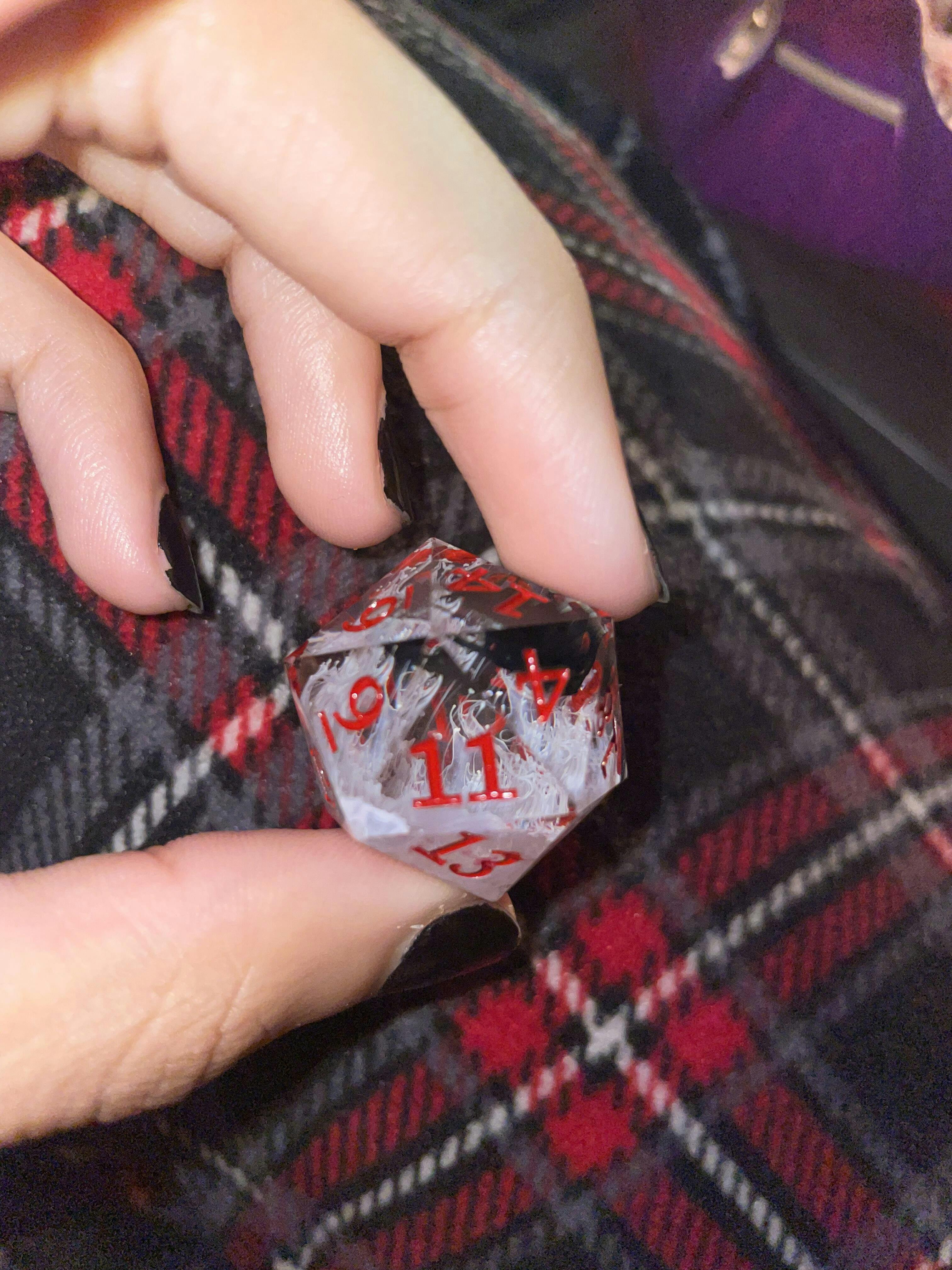 Enchanted with shadow magic, this dice set is inspired by the fearless spellcaster Laudna. The charming, sharp-edged set is transparent white bone with black drip, bearing embossed red numbering and a scissor icon on the 20-side of the d20 die.
