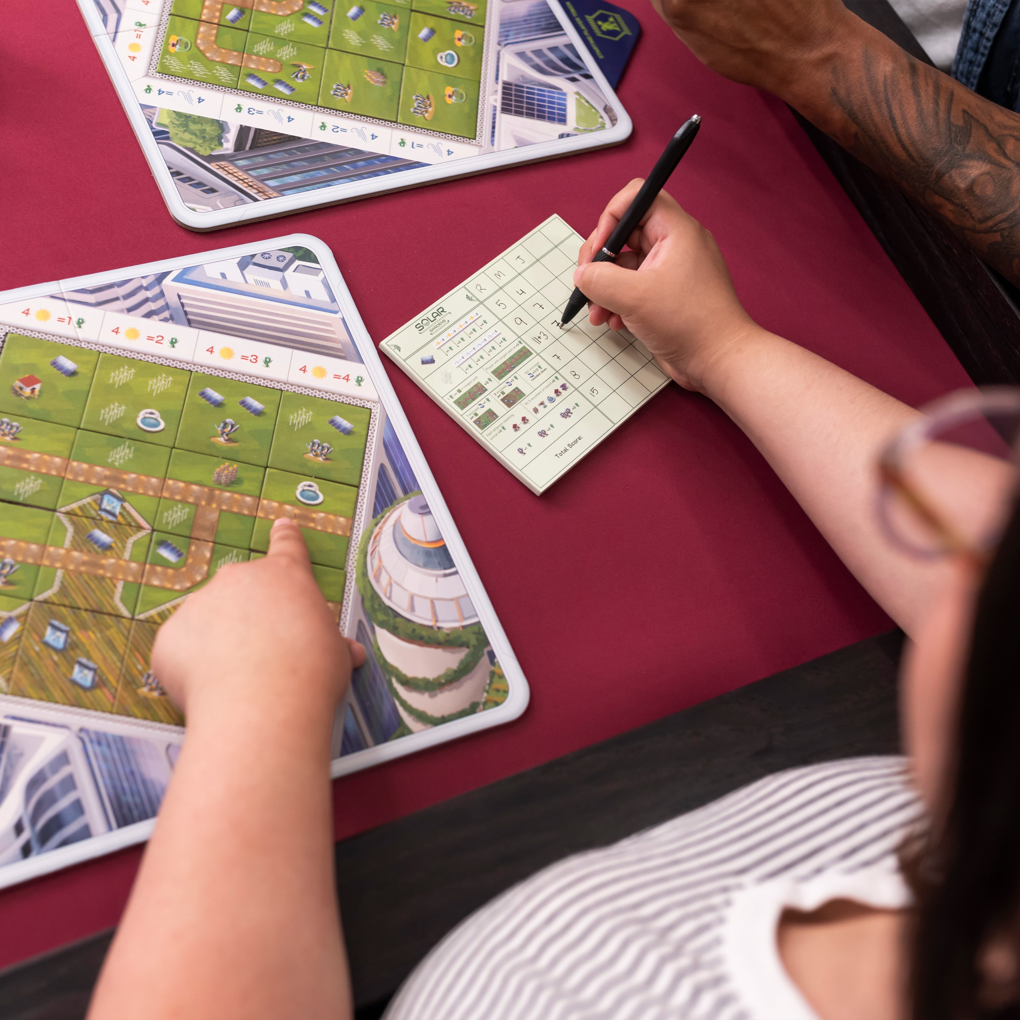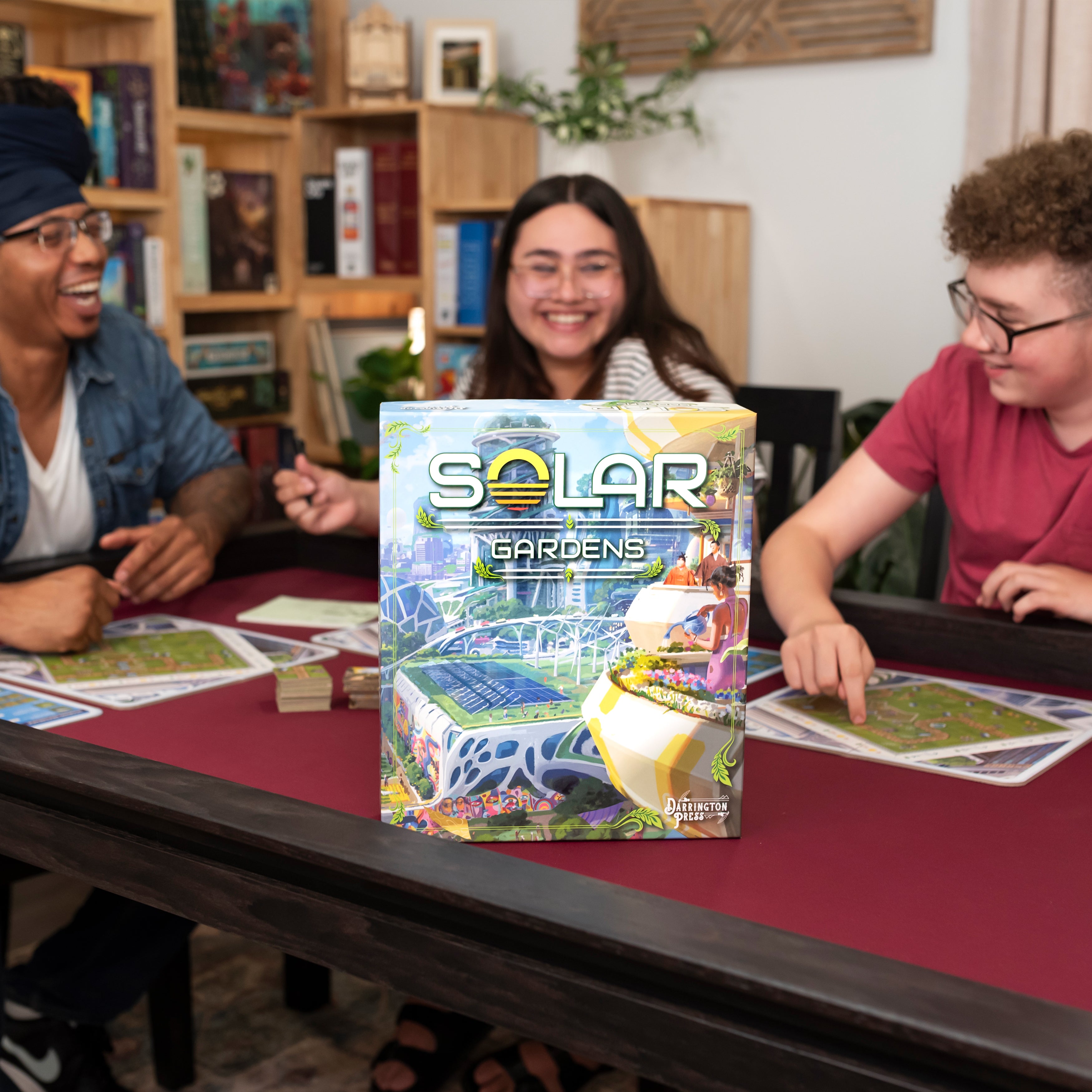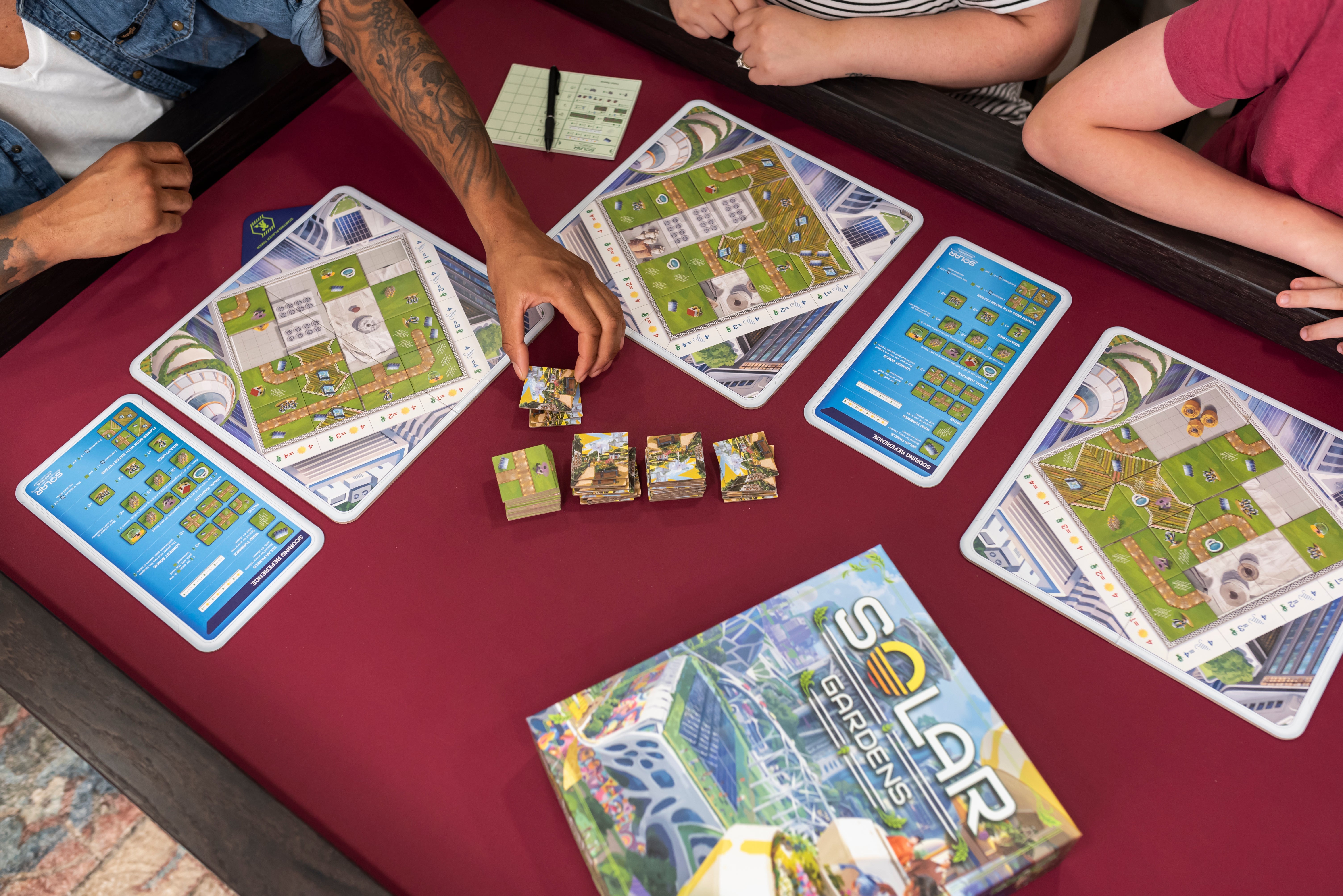 Solar Gardens is a fun-filled, light-hearted tile-drafting board game where each player will take on the role of a visionary architect specializing in carbon neutral engineering to build a rooftop garden in harmony with nature. Guided by principles of sustainability, innovation, community, and strategy, players must work to harness renewable energy to create tranquil garden environments.
